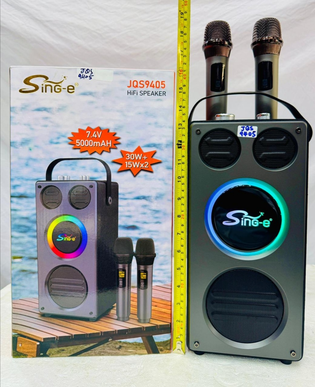 اسپیکر قابل حمل Sing-e مدل JQS‑9405 | میکروفن بیسیم، باتری 5000mAh، توان 30W+15W و نورپردازی RGB