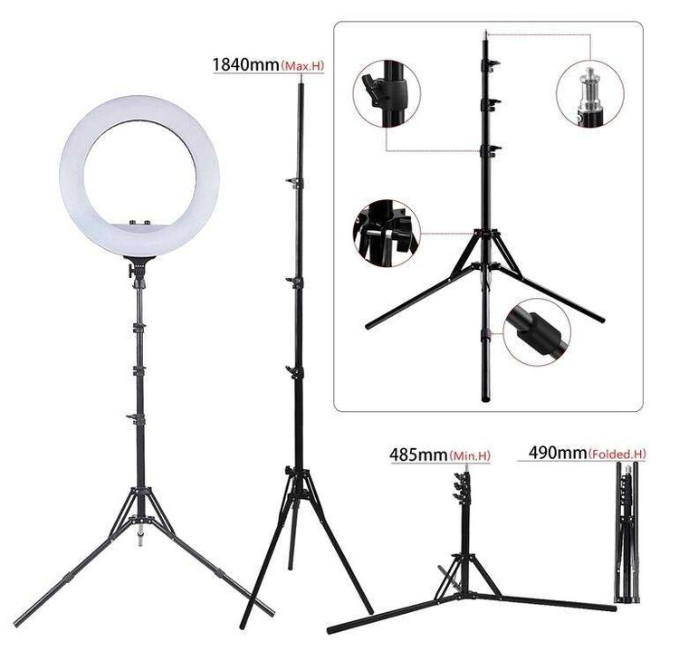 پایه و نگهدارنده قابل تنظیم: همراه با این رینگ لایت، یک پایه محکم و قابل تنظیم ارائه میشود که امکان تغییر ارتفاع و زاویه نور را فراهم میکند. همچنین، نگهدارنده گوشی یا دوربین به شما کمک میکند تا به راحتی تجهیزات خود را در جای مناسب قرار دهید.