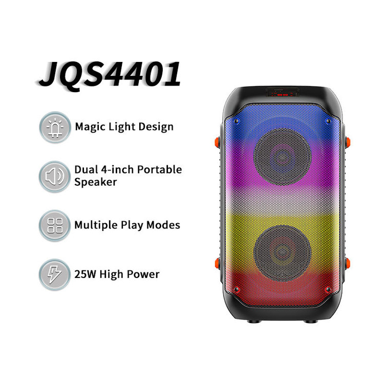 اسپیکر JQS4401 نه تنها به شما صدای باکیفیت و امکانات بینظیری میدهند، بلکه با طراحی زیبا و نورپردازی LED، هر فضایی را به یک محیط شاد و پرانرژی تبدیل میکنند. اگر به دنبال یک سیستم صوتی قابل حمل حرفهای هستید که همه نیازهای شما را برآورده کند، JQS4401 بهترین انتخاب است.