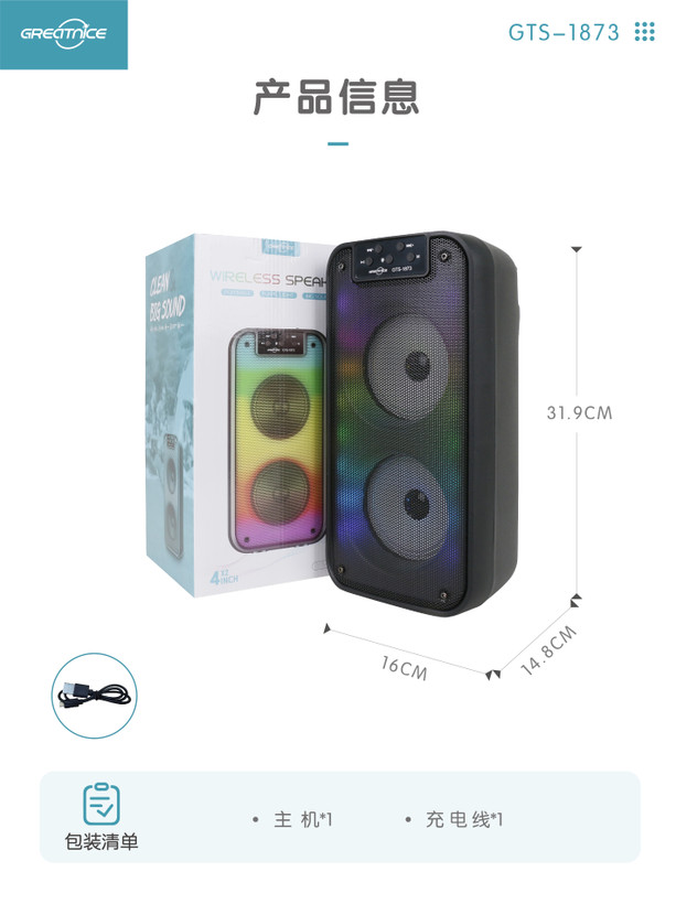 اسپیکر GTS-1873 یک مدل بلوتوثی و قابل حمل است که با دو باند 4 اینچی طراحی شده و به خاطر صدای قدرتمند و کیفیت بالا شناخته میشود. این اسپیکر برای استفاده در مهمانیها و محیطهای باز بسیار مناسب است. در ادامه توضیحات بیشتری ارائه میشود:
