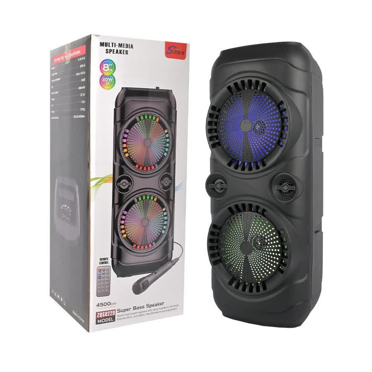 مدل ZQS8229 مجهز به دو ووفر قدرتمند 8 اینچ با تکنولوژی Super Bass و توییترهای با کیفیت است که صدایی شفاف با حجم بالا تولید میکند. این اسپیکر علاوه بر صدای عالی، ظاهر بسیار جذابی دارد؛ نورپردازی چند رنگ LED هماهنگ با ریتم موسیقی فضای مهمانی را هیجانانگیزتر میکند.