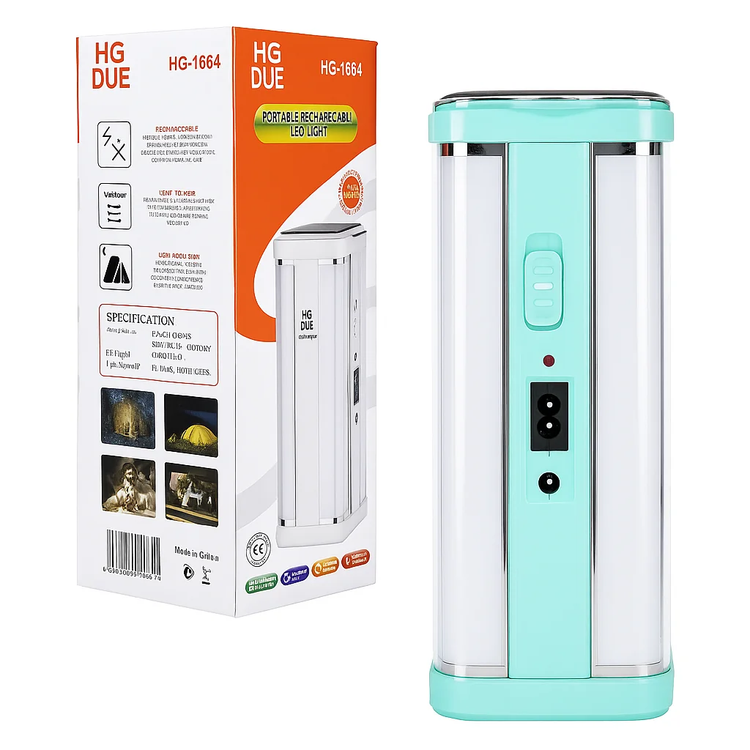 چراغ شارژی HG‑1664 از برند معتبر HGDUB / HG DUE یکی از کاملترین مدلهای چراغ قابل حمل در بازار ایران است. این محصول همزمان سه عملکرد مهم را در اختیار شما قرار میدهد: چراغ روشنایی پرقدرت، شارژ دوگانه (برق و خورشید) و خروجی پاوربانک برای شارژ موبایل، اسپیکر یا سایر لوازم دیجیتال.