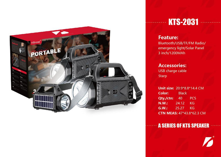 اسپیکر قابل حمل KTS‑2031 | بلوتوث، رادیو FM، چراغ اضطراری و پنل خورشیدی