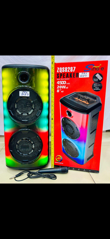 باتری ۴۵۰۰ میلیآمپری آن دوام پخش طولانیمدت فراهم میکند و دو ووفر قدرتمند ۸ اینچی با توان ۲۰ وات × ۲ صدایی غنی و پرانرژی ایجاد میکنند. اسپیکر ZQS‑8287 همچنین دارای میکروفن سیمدار و کنترل از راه دور است تا هم برای مهمانیها و هم برای اجرای زنده عملکردی عالی داشته باشد.