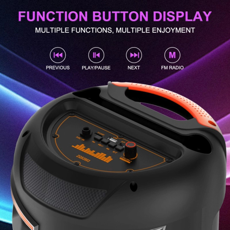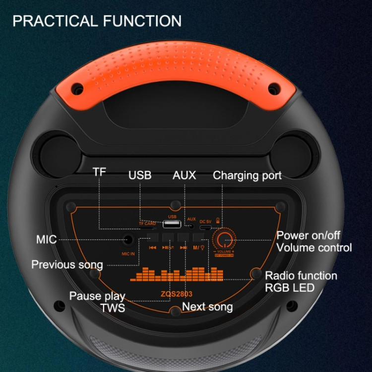 طراحی استوانهای و ارگونومیک با جزئیات براق و چراغهای LED چندرنگ، ZQS2803 را به یکی از شیکترین اسپیکرهای قابل حمل تبدیل کرده است. نورهای RGB همزمان با ریتم موسیقی تغییر میکنند و فضای مهمانی را هیجانانگیزتر میسازند.